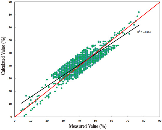 It is found that the logging parameters with higher Pearson values are AC, CNL, and R25 (Table 3 and Figure 4). The fitting equation of the carbonate mineral content by the logging data is as follows: