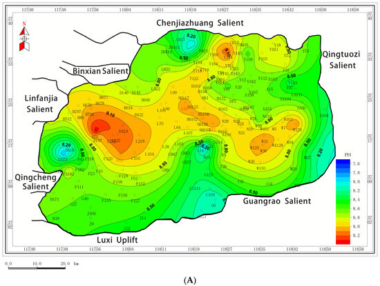 In Es3M, it shows a strip characterized by “high on both sides and low in the middle”, and the environment consists of brackish water and is a neutral environment (Figure 7B). The northwest and southeast of the basin are areas with high salinity and pH values, which are specifically distributed in the Linjifan Uplift, the southeast of the Binxian Uplift, and the Chunhua areas. In the center of the basin is the middle and low value area, which extends from the southeast of Qingcheng Uplift to the northeast direction to Qingtuozi Uplift. This area is located in the slope break zone of the syngenetic fault that controls the central uplift. The fault activity results in the active flow body of the surrounding source, which reduces the pH value of the sedimentary aqueous medium.