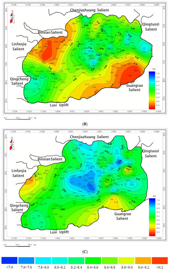 pH plane division scheme of Es3 in Dongying Sag ((A) Es3L; (B) Es3M; (C) Es3U).
