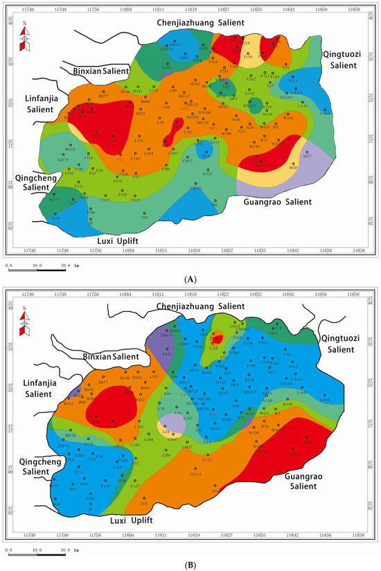 In Es3U, it shows the characteristics of “high on both sides and low in the middle”, which is similar to Es3M. It is a neutral to weakly acidic environment of freshwater, with a significant decrease in salinity and pH (Figure 7C). The areas with low values are significantly expanded, which are distributed in the eastern part of the sag, the south of Chenjiazhuang Uplift, the central uplift, and part of the southwest Jinjia area, accounting for nearly 80% of the basin. The high-value areas are still mainly distributed in the northwest Linfanjia Uplift, the southern margin of Chenjiazhuang Uplift, and the southeast Wangjiagang area, which is opposite to the low-value areas. It is obviously controlled by the development degree of the river delta in Es3U. Within its influence range, the aqueous medium parameters show a low value characteristic.