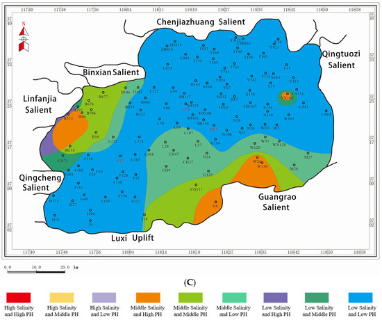 - Es3L is dominated by areas with high salinity–middle pH and middle salinity–high pH, which are rich in carbonate, presenting a saline–brackish alkaline environment. The salinity and pH in Es3M decreased, mainly in middle salinity–middle pH and low salinity–middle pH areas, which were in the brackish neutral environment. Es3U is mainly characterized by low salinity and low pH conditions.