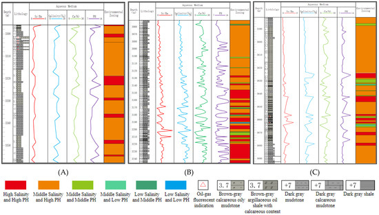 The ratio of Sr to Ba is often used to distinguish the marine and terrestrial sedimentary environments. It has been recognized by many scholars that the ratio is larger than 1 in marine sediments and smaller than 1 in continental sediments. The salinity division values calculated by Formula (1) are 4‰ and 11‰ (Figure 5).