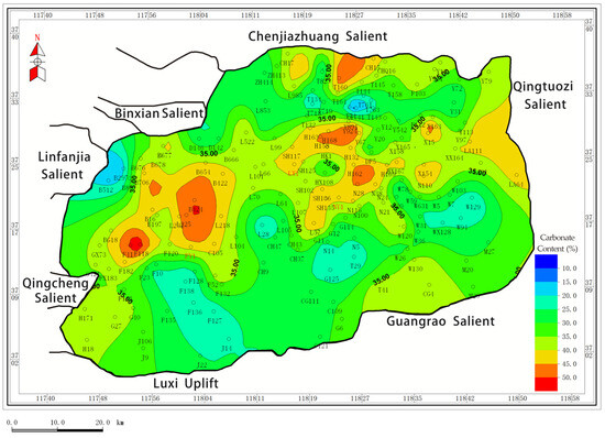 The overall environment of Es3L is a saline-salinity alkaline environment, which is conducive to the development of carbonate rocks. It focuses on the quantitative study of the ash content of the Es3L. According to the fitting formula, the ash content of Es3L is calculated, and the plane distribution map is drawn (Figure 10). The value of carbonate content in Es3L is from 11.39% to 66.25%, with an average of 36.16%. On the plane, the high-value areas with carbonate content greater than 35% are mainly distributed in the central depression zone, especially in the southeast of Linfanjia Uplift, the northeast of Lijin Sub-Sag, and the northwest of Niuzhuang Sub-Sag. The carbonate content in some wells reaches 60%.
