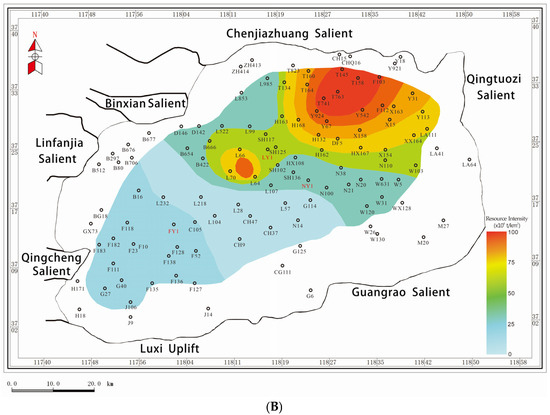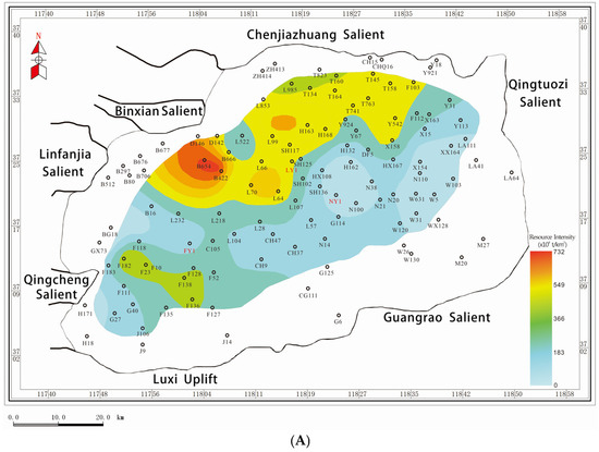 By comparing the free resources of shale oil, it is found that the areas with higher total resource intensity are distributed in the west of Lijin Sub-Sag, while the areas with higher free resource intensity are distributed in the northeast of Lijin Sub-Sag (Figure 12) [38]. This is consistent with the predicted results, and the partitions with high salinity–high pH and high salinity–medium pH are located in the area with a good evaluation of free-phase shale resources.