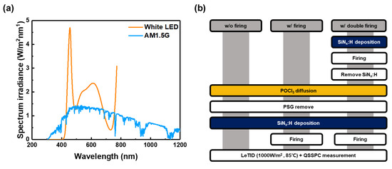(a) Comparison of spectral irradiance of AM1.5G and the white LED used in this paper according to wavelength. (b) The process flow of the lifetime sample is used to figure out the hydrogen distribution and degradation.