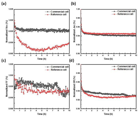Figure 2a–d shows the changes in degradation of commercial and reference cells in the LeTID environment by dividing them into each cell parameter. In the case of the commercial cell, there is an initial decrease in Voc and FF due to the temperature effect, and after Voc and FF also decrease by less than 1%. Therefore, it seems that the decrease in efficiency is almost due to Jsc drop. Reference cells also have a similar tendency to FF and Jsc. However, the Voc decreases significantly compared to the commercial cell during the first 10 h in the LeTID environment. It shows a recovery pattern by regeneration occurring at about 5 h. Although it is not shown in the figure in the text, the reason why the degradation time was set short was because the sample showed the most degradation at around 10 h when it was maximally degraded for 200 h in Figure S1.