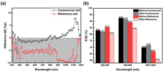 Assuming that there is no change in the reflectance of the sample due to the LeTID environment, it is reasonable to think that the trends of external quantum efficiency (EQE) and internal quantum efficiency (IQE) are the same. Only EQE measurement can quantify the photo-generated carrier concentration and collection probability without reflectance measurement. Figure 3a measures how the EQE value of each cell changes before and after LeTID. Positive numbers on the y-axis indicate an increase, and negative numbers indicate a decrease. The commercial cell shows a slight decrease in the short and medium wavelength ranges but a significant increase in the long wavelength range. The reference cell shows a decrease in almost all wavelengths, and the difference from the commercial cell is clearly shown in the long wavelength range, especially. Figure 3b shows the change in the average value by wavelength. The commercial cell showed a decrease of 1.07%p in the short wavelength band and about 0.67%p in the medium wavelength band, but a 2%p increase was observed in the long wavelength band. Unlike the commercial cell, the reference cell showed a large decrease of 7%p in the wavelength range of 800–1200 nm due to the large loss at 900–1100 nm. This is similar to the results seen in previous literature [20]. Therefore, we will try to check the difference on the front surface, which is a short wavelength. Interestingly, the decrease in Jsc occurred in the commercial cell in Figure 2 but not in the QE results. Of course, since the I-V is an in-situ result, it was continuously measured at 85 °C, so the defects shown in LeTID may have a greater effect at 85 °C. Therefore, for a more detailed analysis, the measurements were made while applying a bias to the QE.