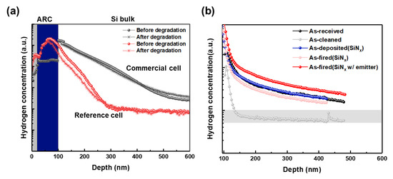 Figure 4a shows the hydrogen profiles near the front surface of the commercial cell and the reference cell before and after degradation. The thickness of the front anti-reflection coating (ARC) layer of the Reference and commercial cells is different. Because, in the SIMS measurement, the concentration peaks represent the interface by the matrix effect. Compared to the commercial cell, the hydrogen concentration of the reference cell is reduced, and most of the hydrogen profile changes are shown on the surface just below the SiNx:H, not the bulk. In contrast, the commercial cell shows little change in the diffusion graph itself, and rather, the concentration in the bulk increases slightly after degradation. In addition, the diffusion amount itself is qualitatively higher in the commercial cell, even after passing the saturation point.