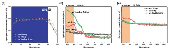 Figure 5b shows the hydrogen concentration distribution before degradation, and we can see that the amount of hydrogen increases with the firing process. As can be seen in Figure 4b, the firing co-occurrence in the presence of an emitter caused the greatest hydrogen diffusion, and in addition, the w/double firing sample showed the greatest amount of hydrogen. The emitter thickness is estimated to be approximately 300 nm. Approximately 300 nm depth corresponds to the junction depth where phosphorus and boron concentrations are equal based on the dopant (~1.0 × 1016 cm−3) in S.I. This is likely due to the slight hill-like shape of the firing sample in Figure 5b, creating a hydrogen peak in the depletion region. It appears that a hydrogen aggregation region is formed in the depletion region of the n+ emitter and the p-type wafer, like the interface. Figure 5c shows the hydrogen profiles of each sample after 1000 h of thermal annealing; all of them are saturated at a certain concentration. The hydrogen concentration decreased in w/double firing samples just below the SiNx:H layer but increased in other samples. This implies that one of two things occurs: Either hydrogen diffuses from the SiNx:H layer, or hydrogen diffuses from the bulk to the surface. Of these two, the latter case appears to be a more convincing mechanism when compared with the existing literature and the pre- and post-diffusion of the SiNx:H layer in Figure S2.