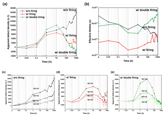 (a) Apparent defect density of sample with log-scale of x-axis, (b) Absolute lifetime over time (1000 W/m2, 85 °C, 1000 h, MCD = 1 × 1014 cm−3). The apparent defect density of the sample with various MCDs, (c) w/o firing, (d) w/firing, and (e) w/double firing.