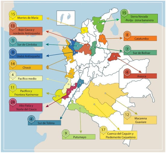 Decree 893 of 2017 considered the following criteria for the prioritization of regions: a. high levels of poverty (i.e., extreme poverty and unmet needs); b. degree of affectation derived from the conflict; c. weak administrative institutions and management capacity; and d. the presence of crops for illicit use and other illegitimate economies []. The multidimensional poverty index is ranked as 72.8%, in contrast with 49.0% for the national level []. It is mentioned that in prioritized or post-conflict regions, strategies to reduce poverty must include the social and productive inclusion of the population.