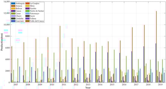 Yearly regionalized production is presented in Figure 3, where it can be observed that the departments of Arauca, Antioquia, Norte de Santander, Cesar, and Tolima have the highest cocoa production during the analyzed period. Arauca was the department with the highest production, with 6270 tons in 2007 and 12,360 tons in 2019, whereas Norte de Santander had 4160 tons in 2007 and 3990 tons in 2019. Cesar produced a total of 2180 tons in 2007 and 3660 tons in 2019, whilst Tolima 2007 had a production of 2740 tons and 1700 tons in 2019. As can be seen in the results, Arauca and Cesar increased the production of cocoa from 2007 to 2019; however, Norte de Santander and Tolima reduced the production by 4% and 38%, respectively.