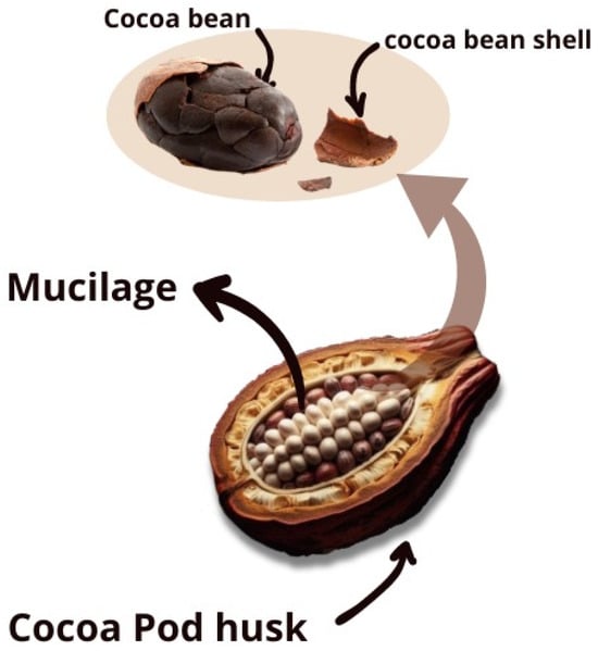 - Cocoa pod husks (CPHs) constitute the external part of the fruit and are composed of three layers (endocarp, mesocarp, and epicarp). It is the most abundant residue (i.e., between 67% and 76% of the mass of the cocoa fruit) and it has been the most studied by several authors [,,]. Among the studies stand those that have found the use of CPH as a precursor for the production of biofuels and fertilizers [], and the production of low added value products such as soaps or animal feed [].