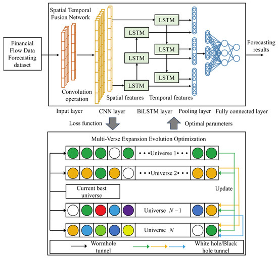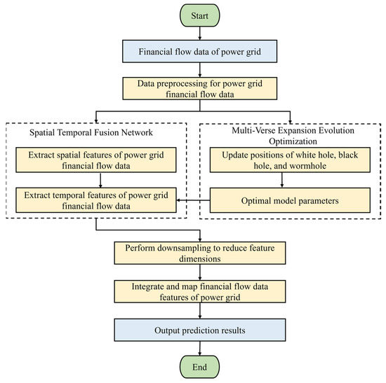 To address the aforementioned challenges, a financial flow data forecasting algorithm based on multi-verse expansion evolution (MVE2) and spatial–temporal fusion network (STFN) is proposed. First, the power grid financial flow dataset is preprocessed based on the ARIMA model to construct a dataset with multi-feature dimensions and strong trend capture. Next, a financial flow data feature extraction model for power grids based on STFN is introduced, leveraging CNN to extract spatial features and BiLSTM to capture the temporal sequence features of financial flow data. This approach organically combines the spatial extraction capability of CNN and the temporal modeling strength of BiLSTM to achieve complementary advantages. Subsequently, a hybrid network fine-tuning method based on MVE2 is proposed, integrating MVE2 with STFN. The parameters of STFN are treated as optimization variables, and MVE2 is utilized to search for the optimal parameter combination. Finally, the financial flow forecasting results are generated through pooling layers and fully connected layers. The main contributions of this paper are summarized as follows: