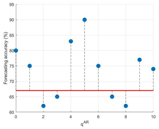 Figure 3 shows the variation in the ARIMA model forecasting accuracy versus moving average order. Moving average order is directly related to the accuracy of the model forecasting. Therefore, it is necessary to determine the order of the ARIMA model before generating the dataset using the ARIMA model. The simulation results show that when the value of the moving average order is 5, the forecasting accuracy reaches the maximum value of 89%. Therefore, the optimal value of the moving average order is determined to be 5.