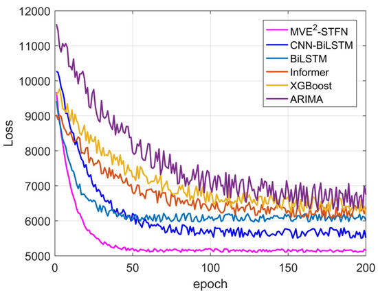 Figure 4 illustrates the variation in loss function across epochs for different algorithms. The loss function can be measured by RMSE. As training progresses, the loss functions of the proposed MVE2-STFN, CNN-BiLSTM, and BiLSTM algorithms all show a rapid initial decline followed by stabilization. Compared to the CNN-BiLSTM, BiLSTM, ARIMA, Informer, and XGBoost algorithms, the proposed MVE2-STFN algorithm achieves convergence rate improvements of 31.78%, 14.43%, 42.65%, 26.18%, and 28.03%, respectively. This advantage arises from the MVE2 algorithm’s strong global optimization capability, fast convergence rate, and minimal parameter tuning requirements. By optimizing the STFN using the MVE2 algorithm, the proposed method effectively mitigates the local optimum issue encountered in traditional training methods, accelerating convergence and enhancing both efficiency and forecasting accuracy in financial flow forecasting. During the initial 0–40 epochs of the proposed MVE2-STFN algorithm, the CNN and BiLSTM layers of the STFN rapidly extract spatial and temporal features from the financial flow data of power grid. Simultaneously, the MVE2 algorithm efficiently adjusts the network parameters, resulting in a sharp decrease in the loss function. After 40 epochs, the MVE2-STFN algorithm has already extracted substantial features from the financial flow data of power grid, and the MVE2 algorithm continues to fine-tune the model parameters. By the 75th epoch, the loss function of the MVE2-STFN algorithm stabilizes at 5135.84, indicating that the algorithm has effectively captured the spatial and temporal features of the financial flow data of the power grid and has reached convergence. The CNN-BiLSTM algorithm struggles to capture the deep coupling of spatiotemporal features, resulting in limited improvements in prediction accuracy. Additionally, due to the local search capability of the Adam optimizer, the parameters are prone to getting stuck in suboptimal solutions, leading to slow convergence. The BiLSTM algorithm overlooks spatial feature extraction, failing to represent the topological relationships of financial flows between regions. Furthermore, its parameter optimization process makes it prone to getting stuck in local extrema, resulting in slow convergence. The ARIMA, Informer, and XGBoost algorithms, due to their simpler models, fail to fully account for the spatiotemporal coupling features and the nonlinearity of financial flow data. Additionally, their parameter optimization strategies lack adaptive global search capabilities, limiting the effective exploration of temporal dependencies and spatial topological relationships, which results in lower convergence efficiency compared to the MVE2-STFN.