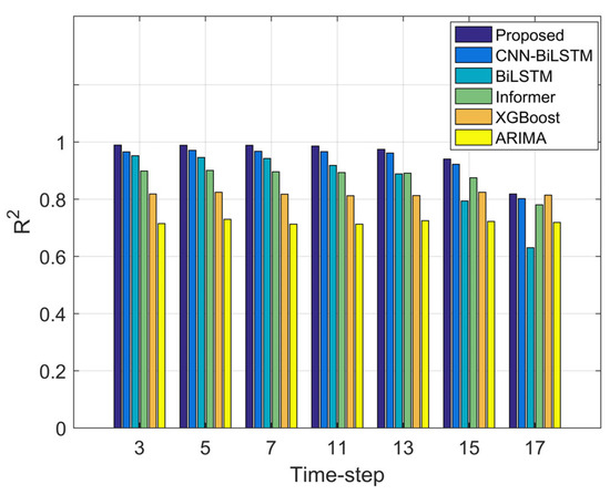 The time step is defined as the length of the input sequence during model training, representing the volume of data processed in each step. Figure 6 illustrates the variation in the value of different algorithms with respect to the time step. When the time step is set to 11, the proposed MVE2-STFN algorithm achieves an value of 0.9935, which represents improvements of 2.82%, 4.71%, 12.67%, 21.65%, and 38.92% compared to the CNN-BiLSTM, BiLSTM, Informer, XGBoost, and ARIMA algorithms, respectively. This demonstrates that the MVE2-STFN algorithm provides the highest forecasting accuracy for grid financial flow data. Furthermore, as the time step increases, the value of the MVE2-STFN algorithm exhibits a trend of first rising and then falling. This behavior occurs because, at shorter time steps, the CNN layer excels at extracting spatial features from the financial flow data, while the BiLSTM layer struggles to capture temporal features, resulting in a lower value. As the time step increases, the BiLSTM layer’s ability to extract temporal features improves, reaching the highest value at a time step of 11. However, when the time step exceeds 11, the CNN layer’s ability to extract spatial features from the financial flow data of power grid diminishes, causing a decline in the value of the proposed MVE2-STFN algorithm. The trend of the value in the CNN-BiLSTM algorithm is consistent with that of the proposed algorithm. However, due to the local search capability of the Adam optimizer, it is prone to getting stuck in local optima, resulting in suboptimal prediction performance. The BiLSTM algorithm relies solely on the extraction of temporal features and lacks spatial feature processing. As a result, it fails to fully capture the spatial information of the power-grid financial flow data, leading to a relatively low value and prediction accuracy. The Informer, XGBoost, and ARIMA algorithms, due to their simple models, fail to effectively capture the complex spatiotemporal features of grid financial flow data. Their limited global search capabilities make them prone to getting trapped in local optima, resulting in low values and poor prediction accuracy.