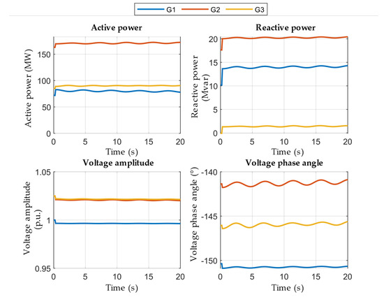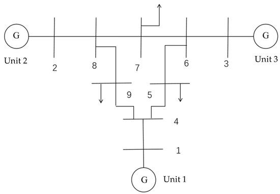 In this study, the DIgSILENT/Powerfactory (2022., DIgSILENT GmbH, Gomaringen, Germany) simulation platform is used to build a test system containing three synchronous generating units, nine bus nodes, and three load areas, and the system topology is shown in Figure 1. The system parameters are shown in Table 1. The simulation model is mainly used to verify the performance of the grid inertia assessment algorithm proposed in this paper, in which the key modeling parameters are related to the rated capacity of the generating units and the inertia time constant. The effectiveness of the proposed method for inertia assessment of synchronous generating units is confirmed by implementing the complete evaluation process and comparing and analyzing the results.