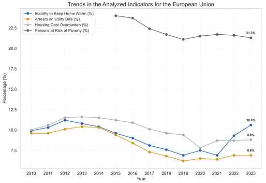An analysis of the dynamics of average values of selected indicators for the European Union (based on the weighted average for EU27 countries) allows for the identification of general trends in energy poverty and the assessment of the impact of major events, such as the post-2021 energy crisis.