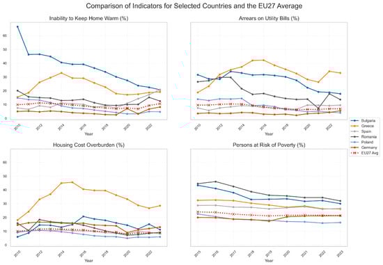 The analysis of energy poverty in this article is based on four indicators available in the Eurostat database, primarily derived from the European Union Statistics on Income and Living Conditions (EU-SILC) survey. The analysis utilizes all available data for the 27 EU Member States for the specified years, with Eurostat’s aggregate figures inherently accounting for any changes in membership composition during the period. It should be noted, however, that each of these indicators has its own specific characteristics and limitations, and a comprehensive understanding of the phenomenon requires their combined interpretation. We will analyze the following indicators [30]: