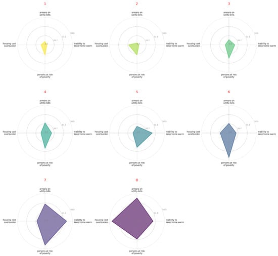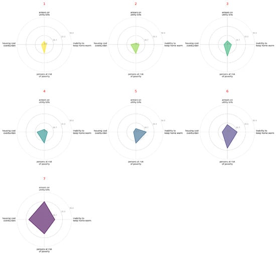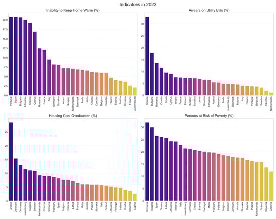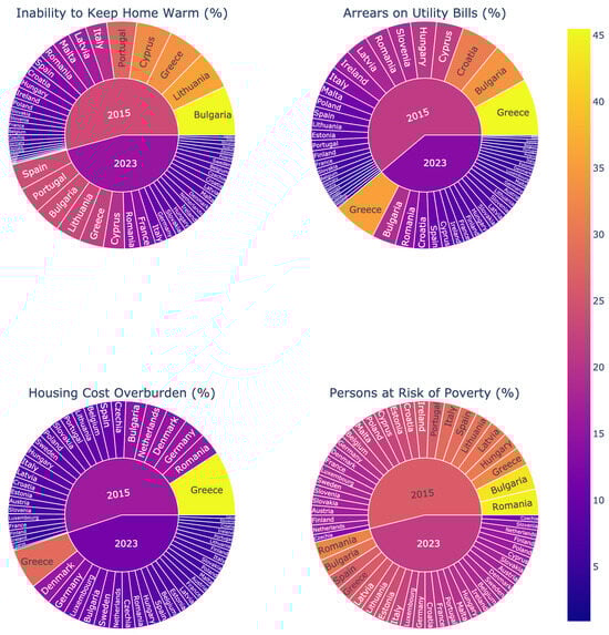 Figure 2 illustrates the comparative dynamics of indicators for selected countries. Those countries represent different geographical regions and energy poverty profiles: Germany (a low-risk Western EU country), Poland (an improving Central European country), and Spain and Greece (Southern EU countries with high or deteriorating indicators). Figure 3 presents the values of the indicators across individual Member States in the year 2023. It consists of four separate bar charts, one for each indicator, where Member States are ranked in descending order. This format allows for an immediate visual assessment of the countries facing the most significant challenges in each specific dimension of energy poverty in the most recent year of analysis. Figure 4, in turn, compares the indicator values for the years 2015 and 2023. It utilizes a radial chart format, where two values are juxtaposed for each country—from 2015 (upper ring) and 2023 (lower ring). This visualization technique enables a direct comparison of the changes over time for each Member State, making it easy to identify countries that have seen the most significant improvement or deterioration.
