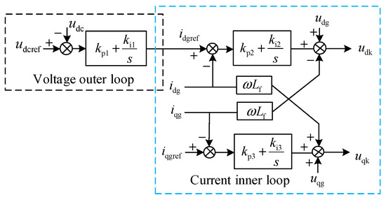 The inverter control in the photovoltaic power generation unit adopts a typical dual-loop control strategy, which consists of an outer voltage control loop and an inner current control loop. On the d-axis, the outer loop employs a PI (proportional-integral) controller to compare the DC-link voltage with its reference value, and the resulting voltage deviation is converted into an active current reference. The inner loop then regulates the active power output of the inverter by tracking the active current reference and generating the inverter’s reference voltage through PI control. On the q-axis, the inner loop directly controls the reactive current. The PI controller processes the reactive current reference, which is typically set to zero, to generate the corresponding reference voltage for the inverter. The control block diagram is shown in Figure 2.