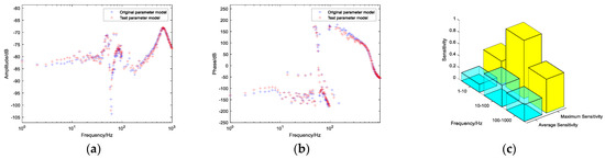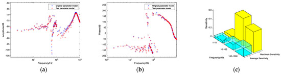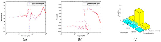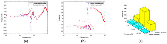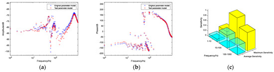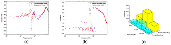 Figure 8. (a) Admittance magnitude-frequency characteristic comparison chart; (b) Admittance phase-frequency characteristic comparison chart; (c) Parameter sensitivity chart.