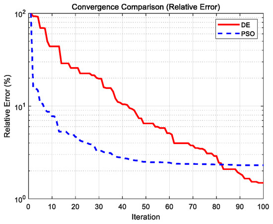 The x-axis represents the number of iterations, and the y-axis represents the error. From the comparison figure, it can be observed that the PSO algorithm converges rapidly in the early stages but levels off later. In comparison, the DE algorithm exhibits a moderate convergence speed and overall stable performance. As the number of iterations increases, both optimization algorithms yield similar final results, with only minor differences remaining.