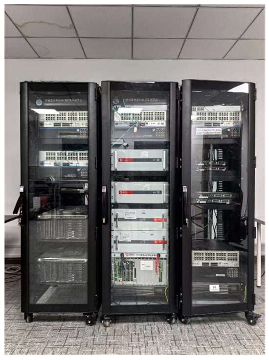 In addition to the electromagnetic model simulation verification mentioned above, relevant engineering experiments have been added to further validate the effectiveness of the proposed method. Therefore, using the semi-physical simulation platform provided by the laboratory, the manufacturer’s 225 kW photovoltaic controller was operated, and its inverter control parameters were identified. The semi-physical simulation platform is shown in Figure 15.