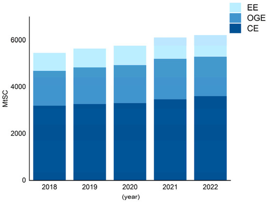 China’s energy consumption between 2018 and 2022 is shown in Figure 2. Total energy consumption in China has consistently enhanced, with the consumption of all three types of energy maintaining a growth trend. The proportion of CE consumption has remained high, exceeding 50%. Over the five-year period, CE consumption grew by 404.47 MtSC, OGE consumption rose by 198.26 MtSC, and EE consumption increased by 159.41 MtSC. Among the three energy types, CE consumption experienced the largest increase, indicating that CE remains the dominant source of China’s energy consumption, while OGE and EE consumption have shown relatively stable growth. This shows that China’s demand for traditional energy is still huge, and traditional energy plays a major role in China’s energy supply. It also highlights how important it is for China to step up its efforts to promote energy-saving measures.