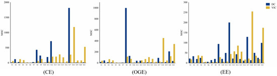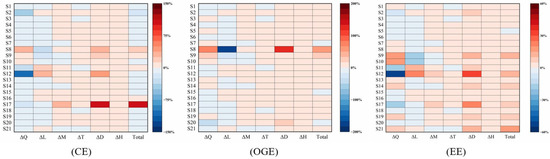 The specific results of energy consumption are presented in Figure 3. For CE, the electricity, gas, and water supply sector (S17) has the highest direct consumption, with a consumption of 1814.12 MtSC, significantly higher than other sectors. This indicates that most CE consumption is applied in the production of other energy sources. The sector with the largest vertically integrated consumption is the construction sector (S18), consuming 1183.94 MtSC. For OGE, the coke, refined petroleum, and nuclear fuel sector (S8) has the highest direct consumption, with a consumption of 997.38 MtSC, again much higher than other sectors. The construction sector (S18) has the largest vertical integration consumption, at 452.14 MtSC. EE consumption is more balanced compared to the other two energy sources. The basic metals and fabricated metal sector (S12) has the largest direct consumption, with 200.23 MtSC, significantly higher than other sectors. The construction sector (S18) has the largest vertical integration consumption, at 254.78 MtSC. These results demonstrate that most energy consumption is concentrated in the energy production or conversion sectors. As the construction industry is highly energy-intensive, its energy needs are substantial, relying heavily on energy input from the energy production sectors [39].