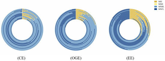 Figure 4 demonstrates the energy consumption and transfer of each sector. The innermost circle in the figure represents the proportion of the four correlation factors for S1, while the outermost circle shows the proportion for S21. In the consumption process, MNBL is the major contributor to both CE and OGE across sectors. In EE consumption, MNFL and MNBL both play significant roles, with MME accounting for the smallest proportion among the three energy consumption processes. These results indicate that China’s energy consumption is primarily driven by production processes, ultimately fulfilling final demand. The heavy reliance of social production on energy is a widespread issue, and nations are working towards reducing energy consumption through cleaner production methods. The analysis also includes energy consumption data for 2018, 2019, 2020, and 2021, which shows minimal deviation from the 2022 results. Due to space constraints, these results are omitted from the article.