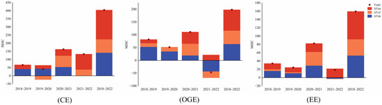Decomposing final demand is essential for understanding the specific types of demand driving energy consumption [43]. We examine the influence of changes in diverse final demand types on energy consumption. Figure 6 shows the energy consumption resulting from different demand categories from 2018 to 2022. CE consumption is mainly due to domestic consumption () and net exports (), and to a lesser extent capital formation (). OGE and EE consumption is mainly derived from exports (), followed by domestic consumption () and the least from capital formation ().
