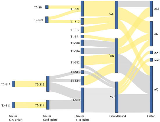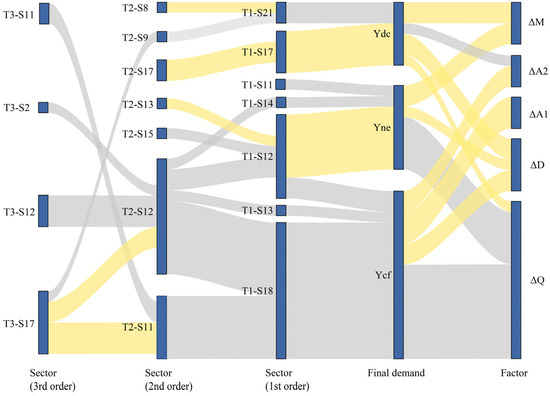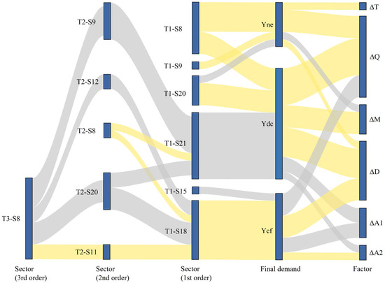CE consumption for 30 critical paths during 2018–2022. Note: From left to right, the figure illustrates changes in CE flows across the thirty critical paths. “Factor” refers to the variable that changes within the transmission path, while “Final demand” suggests the different categories of final demand. The other labels represent sectors at various transmission levels. Gray lines represent a decrease in CE consumption, while yellow lines indicate an increase. In this paper, we apply the term “T” to distinguish flows in different paths. For the first-order path, it is labeled as “T1”; for the second-order path, the flow is represented as “T2 → T1”; for the third-order path, the flow is “T3 → T2 → T1”. These markers highlight the role each sector plays in the supply chain. The features in Figure 9 and Figure 10 are the same as those shown in Figure 8. For detailed data, please refer to Table A2, Table A3 and Table A4 in Appendix A.