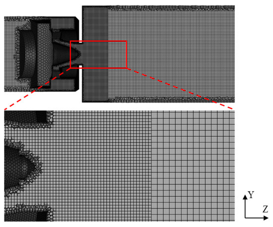 Fluent meshing is used to generate the computational mesh for the combustor model. Specifically, the polyhedral–hexahedral hybrid meshing approach is utilized. Due to the significant variations in flow parameters in the region near the swirler and upstream of the combustor, the mesh is refined in these regions. The mesh size in the refined regions is set as 0.6 mm, while the mesh size in non-refined regions is 1.2 mm. The final mesh distribution is shown in Figure 2.