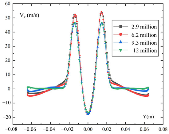 To balance computational accuracy and efficiency, the mesh independence analysis is conducted. Specifically, the mesh in the refined regions is maintained, and the mesh in the left regions is varied to evaluate the effects of the mesh on the flow field parameters. Four types of mesh (total grid numbers are 2.9 million, 6.2 million, 9.3 million, and 12 million, respectively) are analyzed. The mesh independence is verified by comparing the Z-velocity distribution along the Y-direction on the line X = 0 mm at plane Z = 56 mm, as shown in Figure 3. The results indicate that the velocity profiles converge when the grid number exceeds 9.3 million. Therefore, the meshes with the grid number exceeding 9.3 million are chosen for subsequent computations.