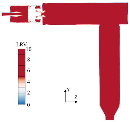 The above parameters to calculate the LRV number can be determined based on cold flow simulations of the non-reacting flow field in the combustor. The regions where the LRV number exceeds 10 indicate that the turbulent integral length scale can include at least 10 grid cells, ensuring a resolution of over 80% of the turbulent kinetic energy [22].