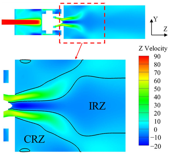 The reliability of the numerical simulation method is validated by comparing the cold flow field results of the combustor with experimental data from Rosa et al. [24]. Figure 5 shows the cold flow field at the X = 0 mm plane of the combustor. As shown in Figure 5, a recirculation zone forms in the upstream region of the combustor. The black curves represent the contour curves of . It can be observed that the high-speed air ejected from the swirler can form swirling jets and divide the recirculation zone into two parts: the inner recirculation zone (IRZ) and the corner recirculation zone (CRZ). These results agree well with the experimental results from Rosa et al. [24].