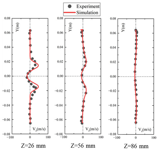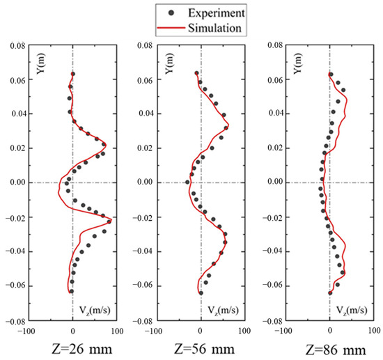 Besides the comparisons of the cold flow field results, the reliability of the numerical simulation method is further verified by comparing the Z-direction velocity along the intersecting line of the plane X = 0 mm and planes Z = 26 mm, Z = 56 mm, and Z = 86 mm, respectively, with experimental data [25], as shown in Figure 6. The comparison results show that in the upstream region of the combustor, the numerical simulation results slightly deviate from the experimental results due to the intense changes in the flow characteristics near the swirler. However, as the flow develops downstream, the numerical simulation results gradually agree well with the experimental data. Therefore, the validation of the reliability of the numerical simulation has been completed.