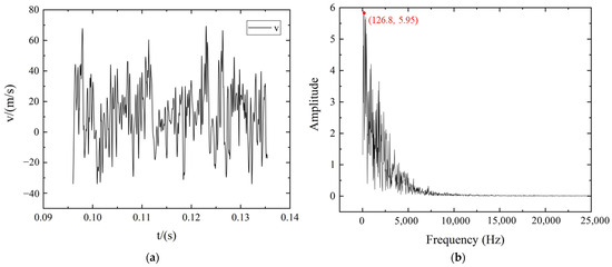 To characterize the flow pulsation frequency in the combustor by LES, temporal variations in axial velocity are monitored at the ignition center (0 mm, 57 mm, 56 mm) before the spark initiation, as shown in Figure 7a. The Fast Fourier Transform (FFT) is utilized to extract frequency information. The result obtained by the FFT is shown in Figure 7b. The spectrogram reveals a dominant pulsation period frequency . The corresponding pulsation period is calculated as , agreeing with the observed experimental combustion pulsation timescale.