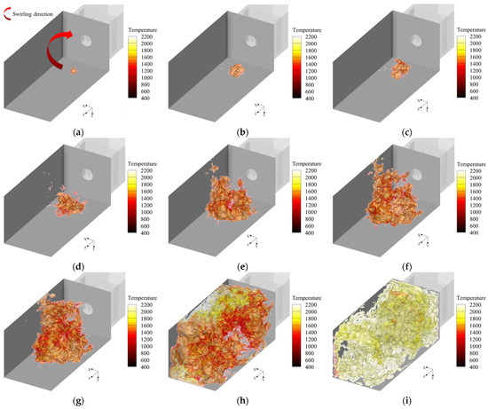 At t = 16 ms (Figure 8h), the flame front propagating downstream further develops and rotates along the swirling direction. At this moment, the flame is fully filled in the entire combustor. High-temperature regions are mainly distributed near the walls, while the central region of the combustor remains in the low-temperature situation.