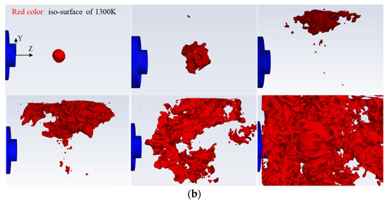 At t = 2 ms (Figure 11b), the forced ignition phase ends. The high-temperature region begins to generate available gaseous fuel, including kerosene vapor and carbon monoxide. There is sufficient combustible gas in the regions enclosed by the 2000 K iso-surface, indicating that stable reactions in this region can release sufficient heat and then significantly enhance the environmental temperature and further generate more available droplets.