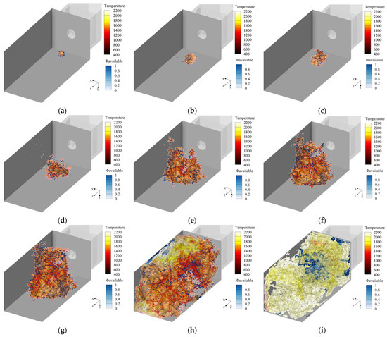 Figure 11 shows the distribution of the available equivalence ratio and temperature field in the combustor at different moments after the trigger of the spark. Similar to Figure 8, the warm color scale represents temperature, and the cold color scale represents the available equivalence ratio. The discrete blue regions represent kerosene droplet clusters and kerosene vapors around them, whereas the continuous blue regions mainly represent the gaseous fuel (kerosene vapor and CO).