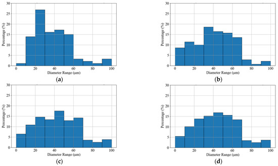 Diameter distributions of available droplets at moments after ignition: (a) t = 1 ms; (b) t = 3 ms; (c) t = 5 ms; (d) t = 8 ms.