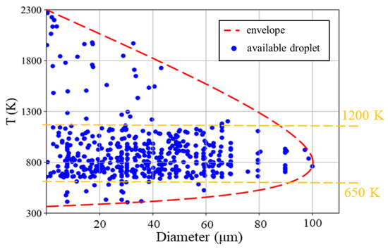 - Most of the available droplets (about 89.2%) concentrate in the regions where the temperatures range from 650 K to 1200 K. Moreover, larger diameter available droplets (i.e., the diameter is larger than 40 μm) also only exist in the regions with this same temperature range. Apart from this temperature range, just a few of the available droplets exist.