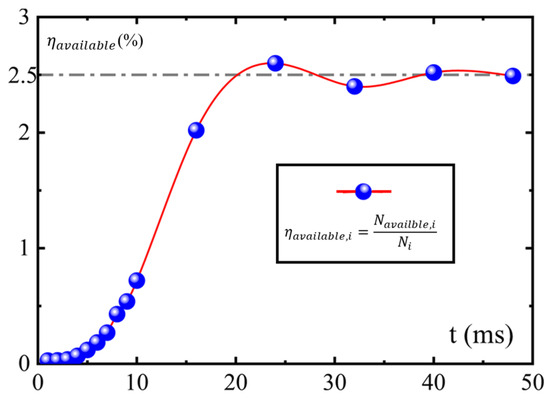 Figure 14 quantifies the dynamic evolution of the number percentage of available droplets with time after ignition in the combustor. It reveals that the number percentage of available droplets increases nonlinearly (approximately exponentially) as the flame develops. As shown in Figure 14, at the end of the first pulsation cycle, i.e., 8 ms, is still below 0.5%. Then, the increased speed of increases with the flame development. Eventually, stabilizes at about 2.5% with small fluctuations at t = 24 ms, which can be attributable to the achievement of thermal equilibrium in the combustor when the combustion sustains stably after ignition. From t = 0 ms to t = 8 ms, temperatures rise from approximately 800 K to 1200 K in the preheating zones. decreases slowly, leading to a slow increase in . From t = 8 ms to t = 24 ms, temperatures in the preheating zones rise to approximately 1500 K. Under this condition, decreases exponentially, while decreases linearly, leading to a rapid increase in . After t = 24 ms, temperatures reach the nearly stable values. Under this condition, the smaller droplets fully evaporate, while larger droplets transport into the “available” size range due to continuous evaporation. Thus, reach a nearly stable value due to evaporation–combustion equilibrium. This result verifies that the approximate exponential number percentage of available droplets is a requisite for a successful ignition.