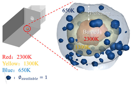 Figure 13 shows the relationship between the diameters of available droplets and temperature distributions in the combustor at t = 5 ms. Most of the available droplets (about 89.2%) concentrate in the regions where temperatures range from 650 K to 1200 K. Moreover, larger diameter available droplets (i.e., the diameter is larger than 40 ) exist in regions with the same temperature ranges, i.e., range from 650 K to 1200 K. In the regions where T > 1200 K, available droplets account for only about 3% of the total droplets, which is attributed to the ignition delay time decreasing exponentially with the increasing temperature. When the ignition delay time is very short, only small droplets can evaporate completely and participate in combustion, whereas large droplets cannot evaporate completely and are classified as unavailable. In the regions where T < 650 K, the droplets evaporate slowly and cannot generate enough combustible mixture in a relatively big region in the combustor. The flame can only occur near the droplets and be sensitive to the low-temperature flow around it. In the regions where the temperatures range from 650 K to 1200 K, small and medium droplets () dominate the fuel vapor supply, as they evaporate fully before ignition. Thus, optimizing atomization can ensure more droplets reach the “available” range and further enhance the ignition reliability. In high-temperature regions, ignition occurs almost instantaneously, leaving insufficient time for large droplets to evaporate. Unevaporated large droplets act as heat sinks, locally reducing temperatures and disrupting flame propagation. Large droplets entrained into high-temperature regions are either convected away or broken up into smaller droplets due to aerodynamic shear.