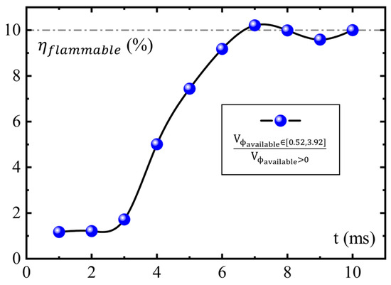 Thus, based on the analyses of flammability in the combustor, the variation in volume percentage of flammable regions with time after ignition can be shown in Figure 16. In the early ignition stage, after the trigger of the spark, grows slowly and reaches 1.72% at t = 3 ms, indicating that most regions in the combustor are in fuel-lean conditions. At this moment, the flame kernel starts to expand and does not fully develop; the spatial-temporal non-uniformities of droplet evaporation and fuel–air mixing lead to the discrete local equivalence ratio distributions. After t = 3 ms, the flame reaches a self-sustained propagation phase, and the flammable region grows rapidly to 10.21%. During this stage, the increased heat release elevates the flow field temperature and improves the droplet evaporation. Moreover, turbulence enhances fuel–air mixing, enabling more regions to reach the flammable condition. After t = 8 ms, stabilizes at about 10% with small fluctuations. Then, high-temperature regions and droplet evaporation achieve a dynamic balance state and further sustain the stable combustion. This study shows that the rapid growth and subsequent stabilization of the flammable region are key indicators of the transition from initial ignition to stable flame propagation.