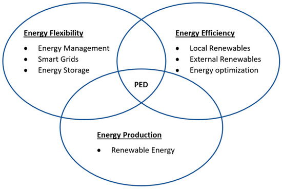 The cornerstones of PEDs are energy efficiency and flexibility and the production of energy in a distributed manner from renewable sources. A high level of energy efficiency ensures that less energy is used to provide the same amount of output from a service, such as heating, cooling and, lighting. Energy flexibility aims to reduce the peak power demand and increase self-consumption by introducing smart grids, adopting optimal energy management processes, and leveraging battery storage solutions.