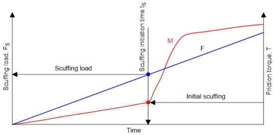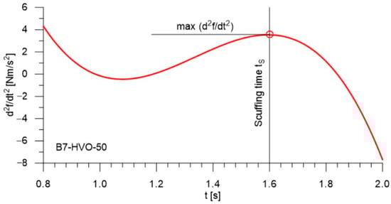The measurement data were subsequently approximated using a linear function for the normal load applied to the friction node, and a fifth-degree polynomial for the COF and friction torque profiles. To clearly identify the time at which scuffing initiation occurred, the second derivative of the friction torque approximation function was calculated. The time corresponding to the local maximum of this second derivative was assumed to represent the point of scuffing initiation. The corresponding load value, denoted as FS, was then defined as the scuffing load. A graphical representation of scuffing time (tS) determination is shown in Figure 3.